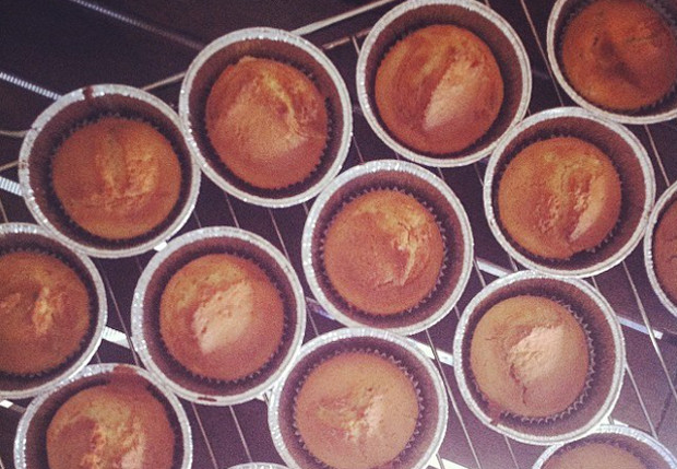 Προθερμαίνουμε τον φούρνο στους 180 βαθμούς και αέρα. Σε μια λεκανίτσα ανακατεύουμε το αλεύρι με τη ζάχαρη και το αλάτι και προσθέτουμε σιγά-σιγά όλα τα υγρά, ανακατεύοντας, μέχρι να έχουμε έναν στέρεο χυλό. Μοιράζουμε σε φορμάκια για cupcakes (εμένα μου βγήκαν 15) και ψήνουμε για περίπου 20 λεπτά.