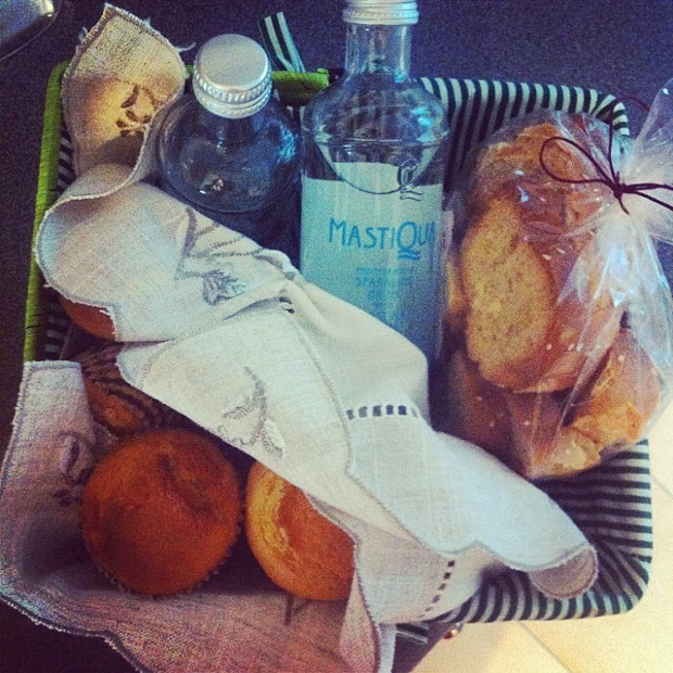 Φυσικά, όταν πρόκειται να προσφέρεις κάτι σπιτικό σε μια επίσκεψη, πρέπει να φτιάξεις και μια ωραία συσκευασία, μην τα πας τυλιγμένα σε αλουμινόχαρτο! Πάντα φυλάω στο σπίτι είδη συσκευασίας από άλλα δώρα, έχω μεγάλη συλλογή από πετσετάκια, αξεσουάρ διάφορα που μπορούν να συμπληρώσουν τσαχπίνικα ένα δώρο. Κι έτσι, πήγα με το καλαθάκι μου! Τα παξιμάδια με γλυκάνισο είναι αγοραστά, αλλά από έναν φούρνο που τα κάνει σαν σπιτικά. Το mastiqua με πάγο και μια φέτα λεμόνι, είναι το καλύτερο συνοδευτικό για τα cupcakes μου.