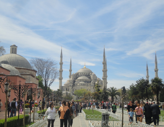 Το Μπλε τζαμί από την άλλη (ονομάστηκε έτσι από τα μπλε κεραμικά Ιζνίκ που στολίζουν το εσωτερικό του) από την εξωτερική του όψη φαίνεται πιο εντυπωσιακό από την Αγία Σοφία, η οποία εξωτερικά ίσως και να μην γοητεύσει τόσο. Η αιτία κρύβεται φυσικά στις θρησκείες που εκπροσωπούν. Σύμφωνα με τον Χριστιανισμό, το σώμα είναι απλώς ένα καλούπι μέσα στο οποίο προφυλάσσεται το σημαντικό κομμάτι κάθε ανθρώπου, η ψυχή. Γι’ αυτό η Αγία Σοφία είναι ασυγκρίτως πιο φροντισμένη στο εσωτερικό της. Εν αντιθέσει, για τον Μουσουλμανισμό, η εξωτερική πλευρά είναι πιο σημαντική, κι έτσι ακόμα και στην αρχιτεκτονική αυτό ανακλάται, αφού ο ζήλος στρέφεται στην τελειότητα της εξωτερικής πλευράς του Μπλε Τζαμιού.