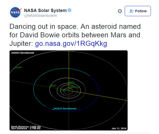 Ανακαλύφθηκε το 2008 και ονομάστηκε τότε 2008 YN3. Πρόκειται για έναν αστεροειδή ανάμεσα στις τροχιές του Άρη και του Δία. Τώρα η NASA αποφάσισε να τον μετονομάσει 342843 Davidbowie στη μνήμη του πρόσφατα χαμένου τραγουδιστή που έγραψε την δική του μουσική ιστορία.