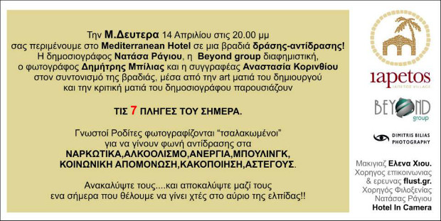 Επτά πληγές του σήμερα… Πως μπορούν να γίνουν τέχνη, ελπίδα, φωτεινό αύριο; Πως μπορούν να γίνουν φωνή διαμαρτυρίας για επτά γνωστούς Ροδίτες που φωτογραφήθηκαν “τσαλακωμένοι”, σε ρόλους εντελώς αντιφατικούς με το προφίλ και την ζωή τους. Την Μ.Δευτέρα ξεκινά η εβδομάδα των παθών και στο ξενοδοχείο Mediteranean στις 8 το βράδυ η γνωστή δημοσιογράφος Νατάσα Ράγιου σε συνεργασία με την συγγραφέα Αναστασία Κορινθίου, θα μας παρουσιάσουν τα προβλήματα του τώρα, που θέλουμε να γίνει χτες, σε ένα αύριο ελπιδοφόρο. Η beyond διαφημιστική και η Εμμανουέλλα Αραμπατζή είχε την σκηνοθετική επιμέλεια, ο Δημήτρης Μπιλιάς επιμελήθηκε την φωτογράφηση και η Ελένα Χιου το μακιγιάζ.
