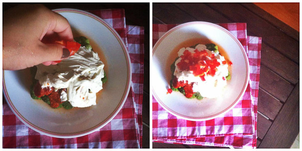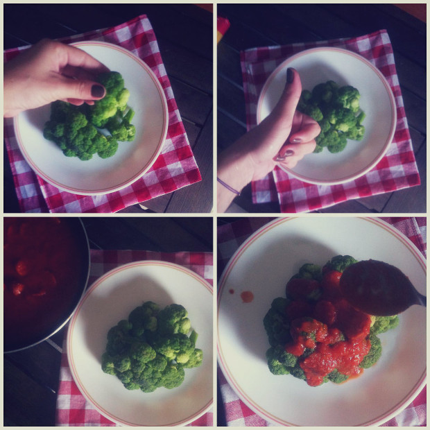 Όπως θα δείτε και από τις φωτογραφίες, η διαδικασία δεν είναι μόνο εύκολη, αλλά και όμορφη, χάρη στα υπέροχα χρώματα των συστατικών. Έβρασα για 4 λεπτά το μπρόκολο και κράτησα μόνο τις φουντίτσες του, χωρίς τα κοτσάνια. Τα περιέχυσα με την κόκκινη σάλτσα που είχα φτιάξει, χωρίς να βάλω λουκάνικο.