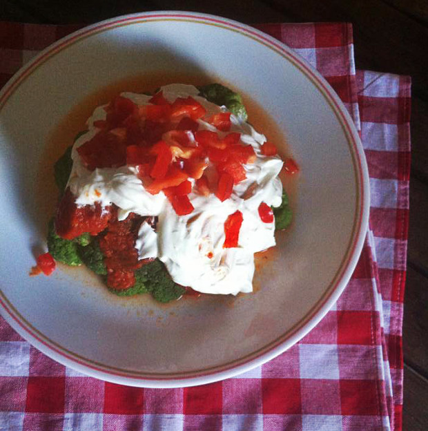 Εκεί που έφτιαχνα μια κόκκινη σάλτσα για τα μακαρόνια μας με λουκάνικο Μάνης με πορτοκάλι (υπέροχο μέσα στα κοκκινιστά!), σκέφτηκα να χρησιμοποιήσω και λίγη για να συνθέσω ένα γιαουρτλού πολύ ξεχωριστό. Ένα γιαουρτλού με μπρόκολο!