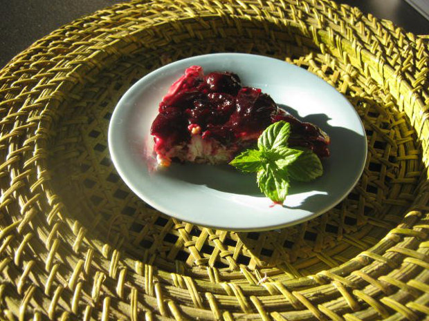 Σήμερα θα σας δώσω δύο αγαπημένες συνταγές που ξαναέφτιαξα προχτές Χρησιμοποίησα γλυκό του κουταλιού βύσσινο, αλλά όταν βγουν τα κεράσια, μπορείτε να φτιάξετε μια πρόχειρη μαρμελάδα με φρέσκα φρούτα και πάντα διαλέγω digestive μπισκότα που μοσχοβολάνε και τρίβονται εύκολα. Ανακάτεψα τα μπισκότα με μια κουταλιά της σούπας βούτυρο λιωμένο και τα έστρωσα ομοιόμορφα σε ένα ταψάκια στρογγυλό, μιας χρήσης, ώστε να γίνει μια λεπτή βάση για τα υπόλοιπα υλικά. Άφησα το ταψάκι στην κατάψυξη να παγώσει η βάση. Στο μίξερ χτύπησα καλά 200 γρ κρέμα γάλακτος, μέχρι να γίνει σαντυγί, την άφησα στην άκρη και χτύπησα 200 γρ. φιλαδέλφια με 1 φλιτζάνι άχνη ζάχαρη και 1/4 φλιτζανιού αφέψημα μέντας. Ένωσα τις 2 κρέμες απαλά και έστρωσα το μίγμα πάνω στη βάση με τα μπισκότα. Έβαλα το ταψάκι μου στο ψυγείο για μισή ωρίτσα να “δέσει” η κρέμα και έπειτα τη στόλισα με το γλυκό.