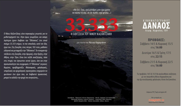 33.333 είναι ο μαγικός αριθμός στίχων από τους οποίους αποτελείται η ‘’Οδύσεια’’ (ναι, με ένα σίγμα) του Νίκου Καζαντζάκη, ένα από τα εκτενέστερα έργα της νεοελληνικής γραμματείας. ‘’33.333’’ είναι και ο τίτλος του ντοκιμαντέρ του Μένιου Καραγιάννη που περιστρέφεται γύρω από το υποτιμημένο έπος του Καζαντζάκη και τις κεντρικές θεματικές που διέπουν αυτό όπως και το σύνολο της εργογραφίας του.