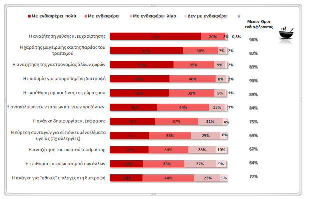 Στην ερώτηση «τί σας ενδιαφέρει/γοητεύει περισσότερο στο φαγητό;», οι foodies θέτουν ως προτεραιότητες – όπως φαίνεται και στον παρακάτω πίνακα – την ικανοποίηση του ουρανίσκου τους, το μοίρασμα αυτής της ικανοποίησης με τους συνδαιτυμόνες τους και την υιοθέτηση μιας ισορροπημένης διατροφής (όλα ισχυρά στοιχεία της ελληνικής κουζίνας).
