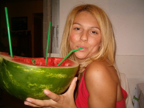 Σε κάποια γενέθλιά μου, παλαιότερα, είχαμε πάρει ένα μεγάλο καρπούζι, το είχαμε ανοίξει στη μέση και βάλαμε τα κεριά πάνω στην ψίχα του καρπουζιού! Ήταν πολύ πιο όμορφο από κάθε τούρτα! Όταν έσβησα τα κεριά, βγάλαμε την ψίχα του, το γεμίσαμε με ρούμι, παγάκια, δυόσμο και κομμάτια lime! Το αφήσαμε να παγώσει, το γεμίσαμε καλαμάκια και απολαύσαμε το καλύτερο ποτό του κόσμου! Όλο το άρωμα του καρπουζιού σε συνδυασμό με το ρούμι έδιναν μοναδική γεύση!! Στην παρακάτω φωτογραφία βλέπετε ότι έχω γίνει κι εγώ ”πίτα” από το καρπουζοποτό!