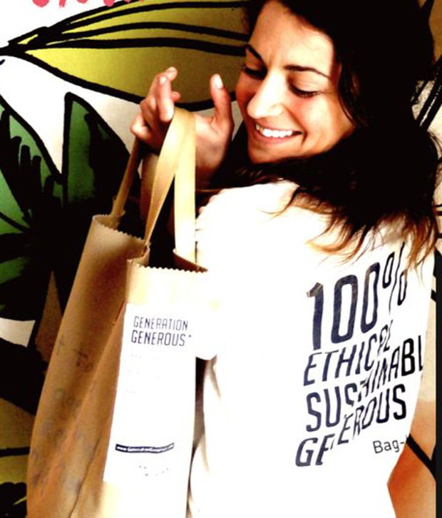 Η εταιρία μου Generation Generous βρίσκεται στο Λονδίνο. Η ιδέα να κατασκευάσω μια τσάντα ξεκίνησε όταν περπατώντας στην Oxford Street βλέποντας τις shopping bags φαντάστηκα μια τσάντα που να είναι φιλική προς το περιβάλλον σεβόμενη και τους εργαζόμενους που θα δουλέψουν για την κατασκευή της. Ξεκίνησε λοιπόν σαν ένα μικρό πιλοτικό πρότζεκτ και πήγε αρκετά καλά χωρίς σχετικά μεγάλη διαφήμιση, σε μια περίοδο που το sustainable fashion ανέβαινε αρκετά σιγά. Είναι μια all day bag που συνδυάζεται εύκολα σε πολλά διαφορετικά στυλ και περιπτώσεις. Είναι φτιαγμένη από 25 μικρά πλαστικά μπουκαλάκια και έχει μια επίστρωση από ένα φιλμ από ανακυκλωμένα υλικά.