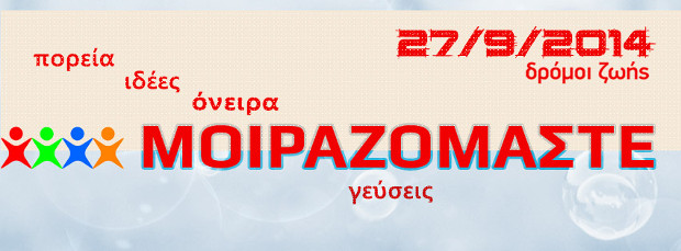 1. Οι Δρόμοι Ζωής ξεκινούν την καινούργια χρονιά με χαρά, δημιουργικότητα και εμπιστοσύνη ότι μπορούν να συνεισφέρουν για μια καλύτερη Κοινωνία. Και γιορτάζουν αυτό το νέο ξεκίνημα με την Εκδήλωση «Μοιραζόμαστε» που θα γίνει το Σάββατο 27 Σεπτεμβρίου 2014 και ώρα 21.00 στο Κέντρο Επικοινωνίας στο Γκάζι. «Μοιραζόμαστε» λοιπόν τις ελπίδες μας και τα όνειρα μας για μια πιο ουσιαστική Συλλογική Ζωή. «Μοιραζόμαστε» τις ιδέες μας και τα συναισθήματα μας για τον Δρόμο που θέλουμε να διανύσουμε σαν Άνθρωποι-συνοδοιπόροι. «Μοιραζόμαστε» το φαγητό μας, ένα δείπνο Αγάπης, γι’ αυτό και σας καλούμε όλους, ας μη λείψει κανείς.