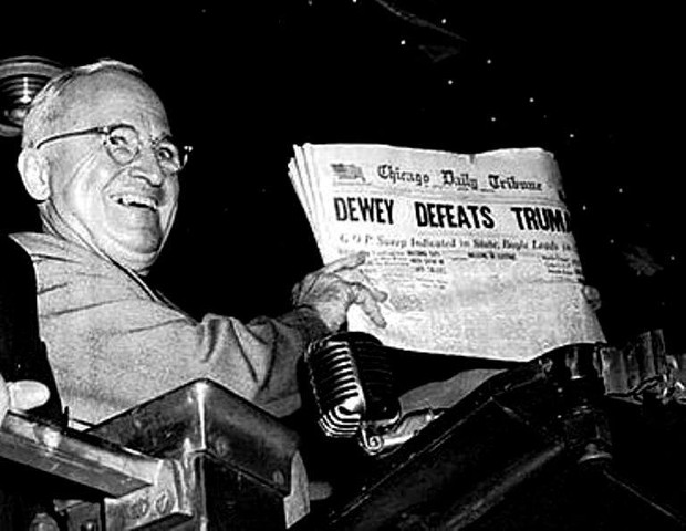 Η εφημερίδα είχε τυπώσει τα πρωινά της φύλλα με τον κεντρικό τίτλο «Ο Dewey κατατροπώνει τον Τρούμαν». Περίπου την ίδια ώρα, θα ταν δεν θα ταν 4 το πρωί ο Χάρυ σηκώθηκε να ακούσει ράδιο το οποίο τον έβγαζε μπροστά ήδη κατά 2 εκατομμύρια ψήφους. Μα τι στην ευχή συμβαίνει; Είναι ή δεν είναι χαμένος; Μα η Tribune το λέει ξεκάθαρα ότι ο Χάρυ έφαγε σκόνη.