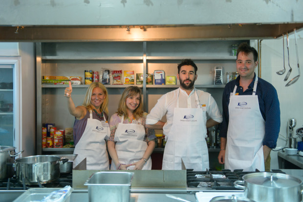 Μετά την χαλαρή κουβέντα που είχαμε και αφού απάντησαν σε όλες μας τις ερωτήσεις, μας αποκάλυψαν την έκπληξη! Μας έδωσαν από μια ποδιά και μερικά πακέτα ψάρια και θαλασσινά και μας προκάλεσαν να μπούμε στην κουζίνα και να δημιουργήσουμε ό,τι λαχταράμε! Η κυρία Πρόεδρος μεταμορφώθηκε κι έγινε για λίγο “μαμά” μας. Έβαλε κι εκείνη ποδιά και μπήκε μαζί μας στην κουζίνα, έφτιαξε δύο δικές της γρήγορες συνταγές και παρακολουθούσε και τις δικές μας, κάνοντας “μαμαδίστικες” παρατηρήσεις του στυλ “αυτό θέλει κι άλλο νερό”, “πολύ αλάτι έχεις βάλει εδώ” και τέτοια. Η όλη φάση θύμιζε πραγματικά ελληνική, φασαριόζικη οικογένεια που βρέθηκε μετά από καιρό!