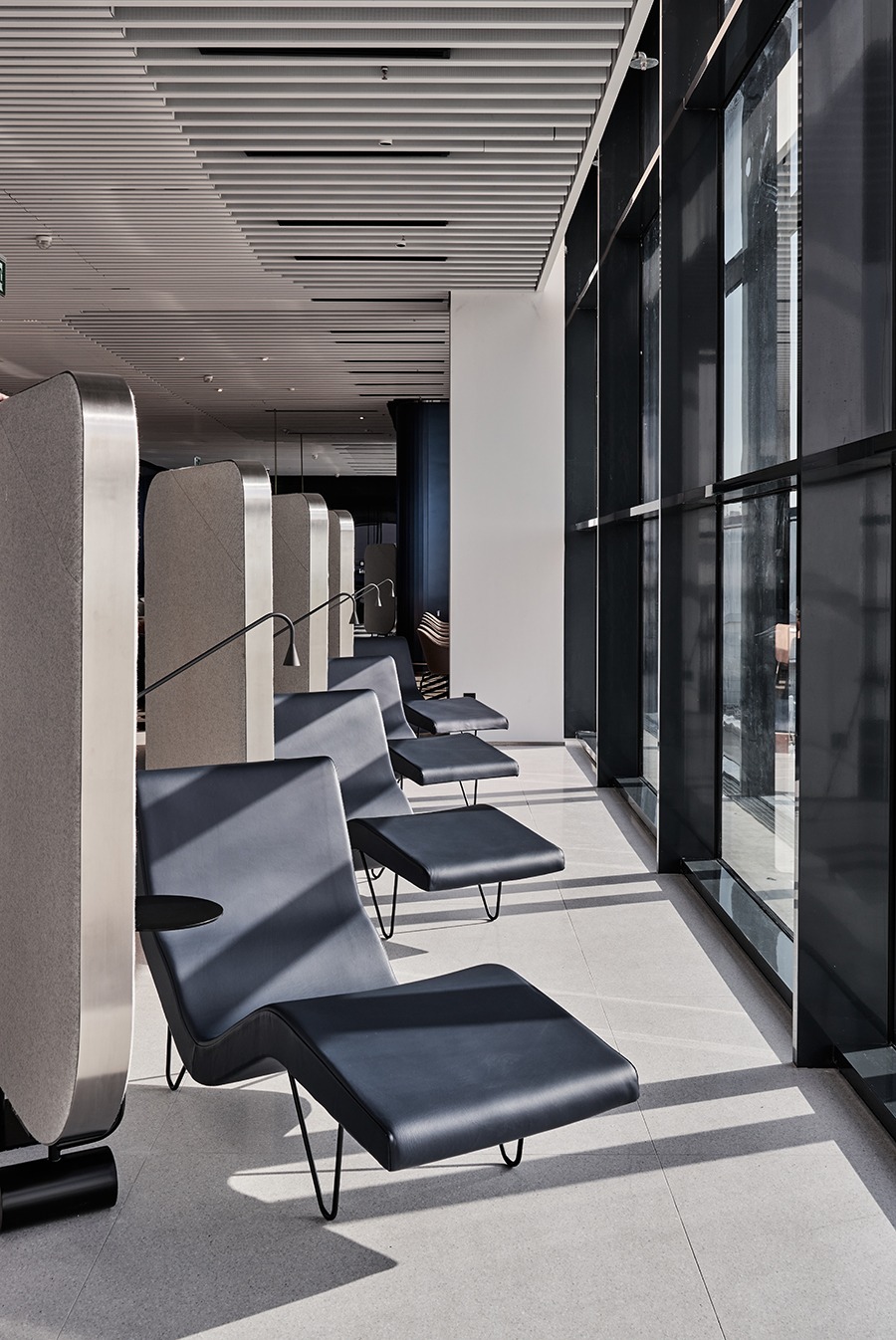 Το φυσικό φως και η εντυπωσιακή θέα στους διαδρόμους προσγείωσης και απογείωσης του αεροδρομίου σε συνδυασμό με τα υλικά υψηλής ποιότητας όπως το μάρμαρο, το μωσαϊκό, το γυαλί και το ξύλο δημιουργούν ένα σύγχρονο και μοντέρνο χώρο. Κεντρική αίθουσα, media lounge, ειδικά διαμορφωμένος χώρος για περισσότερη ιδιωτικότητα και χαλάρωση, privée meeting rooms, δυο καφέ, μεγάλο εστιατόριο σε συνδυασμό με wine bar.