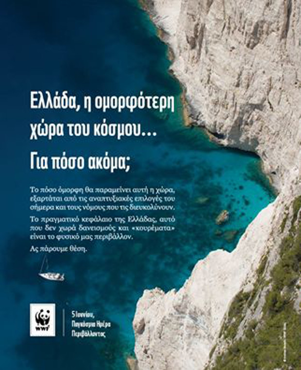 Το πόσο όμορφη θα παραμείνει αυτή η χώρα, εξαρτάται από τις αναπτυξιακές επιλογές του σήμερα και τους νόμους που τις διευκολύνουν. Το πραγματικό κεφάλαιο της Ελλάδας, αυτό που δεν χωρά δανεισμούς και «κουρέματα» είναι το φυσικό μας περιβάλλον. Η WWF μας καλεί να πάρουμε θέση. 5 Ιουνίου, Παγκόσμια Ημέρα Περιβάλλοντος.