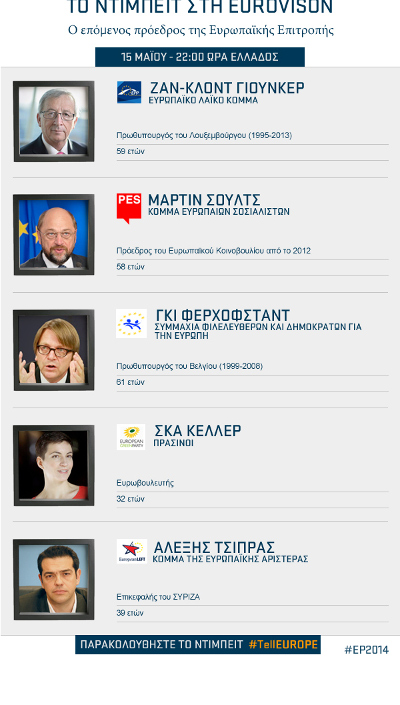 Για πρώτη φορά θα είναι παρόντες όλοι οι υποψήφιοι για την προεδρία της Ευρωπαϊκής Επιτροπής: ο Ζαν-Κλοντ Γιούνκερ από το Ευρωπαϊκό Λαϊκό Κόμμα, ο Μάρτιν Σούλτς από το Κόμμα των Ευρωπαίων Σοσιαλιστών, ο Γκί Φέρχοσταντ από το Κόμμα των Φιλελεύθερων και Δημοκρατών, η Σκα Κέλλερ από το Κόμμα των Πρασίνων και ο Αλέξης Τσίπρας από το Κόμμα της Ευρωπαϊκής Αριστεράς. Περισσότερες πληροφορίες στο γράφημά μας.